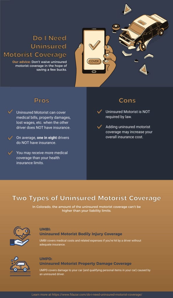 In Colorado, insurance companies are required to offer UMBI as part of any standard auto policy, unless you formally waive that coverage in writing. You can also purchase additional UMPD insurance to cover damage to your car caused by an uninsured driver, but depending on the policy and deductibles involved, that damage may also be addressed through collision and comprehensive coverage.