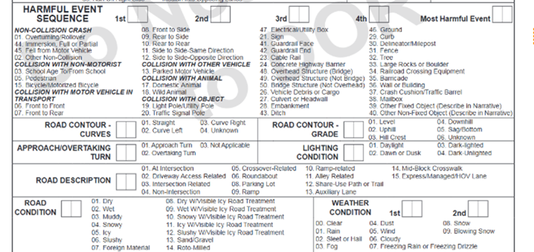 Each of the codes outlines the specific factors involved, such as striking a bridge or colliding with an animal. It then includes additional details, such as whether there were curves in the road at the time of the crash, the road’s grading, and the lighting conditions. It also allows for clarification of where on the road it occurred (such as at an intersection) and the road conditions (such as icy or snow-covered).