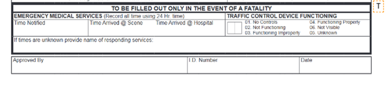 The next section is only filled out if a person dies as a result of the accident. It documents the time emergency professionals arrived and reached the hospital. It also allows police to document the traffic control device at the scene and determine if it was working or not.