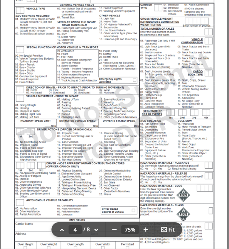 If the accident involved a truck or other commercial vehicle, this will be noted on the report. It will outline the special function of the vehicle as well as its size. Here is where we learn whether it was carrying HAZMAT materials, how the driver behaved, whether there were any autonomous capabilities, and more.