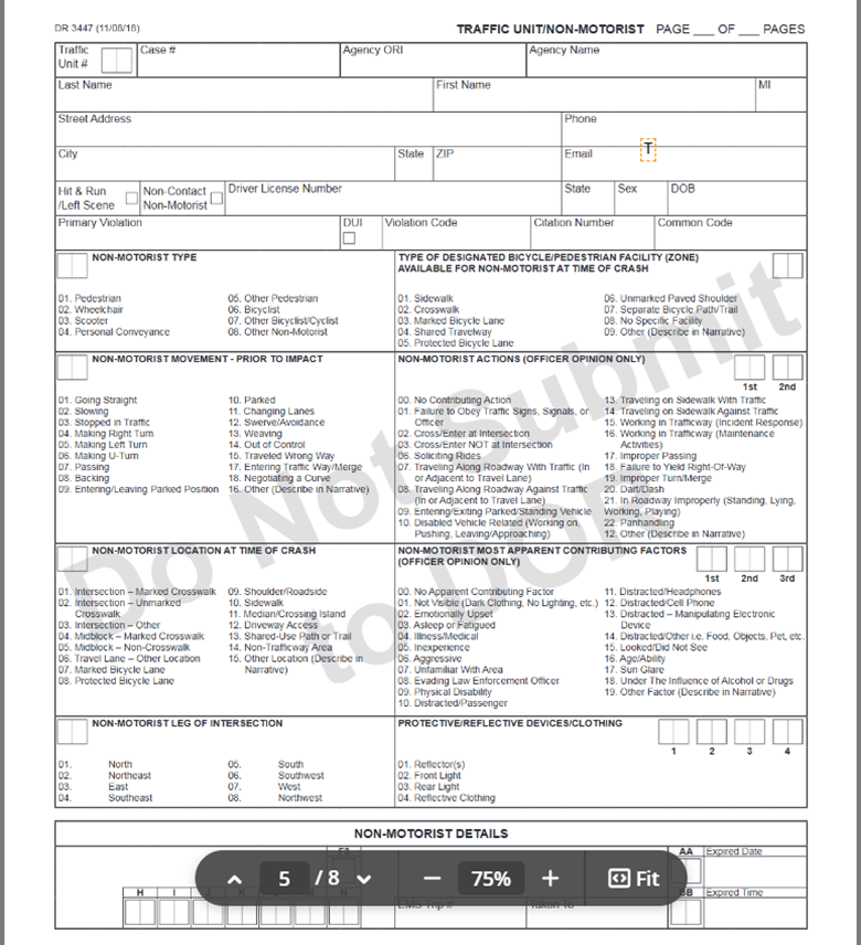 The next section (Traffic Unit/Non-Motorist) is completed in the event of a crash with a non-motorist, such as a pedestrian, scooter rider, or cyclist. It identifies the type of non-motorist, the location of the accident (such as whether it happened on a bike path or a sidewalk), and the type of movement of the non-motorist just before impact, among other factors.