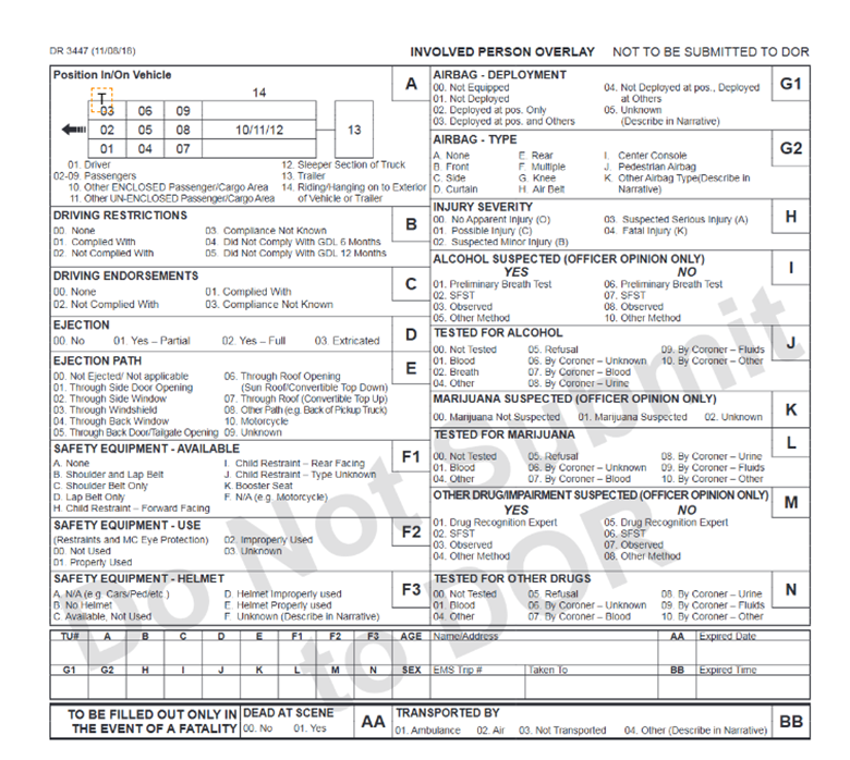 In the Involved Person Overlay, the crash report breaks down more information that’s often critical to the cause of the accident. It will outline details such as: